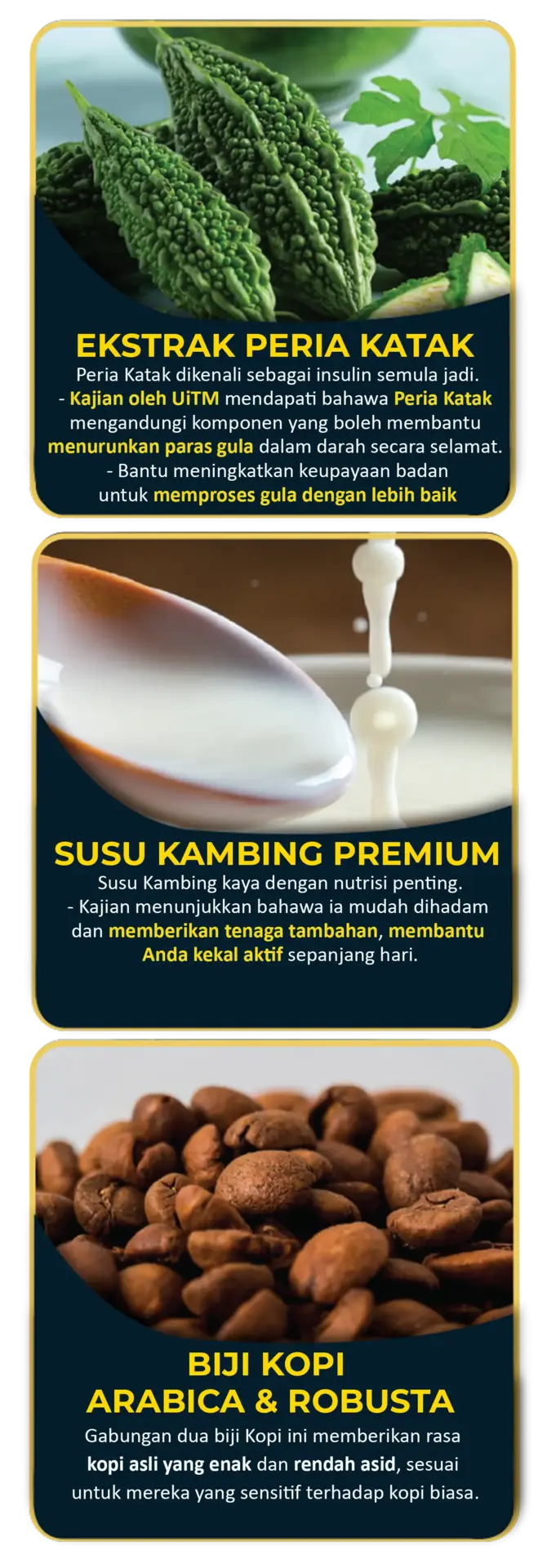 Gabungan bahan-bahan ini menjadikan KOPI ALA KAZIM berkesan, selamat dan sesuai untuk mereka yang mahu kawal gula dengan selamat.